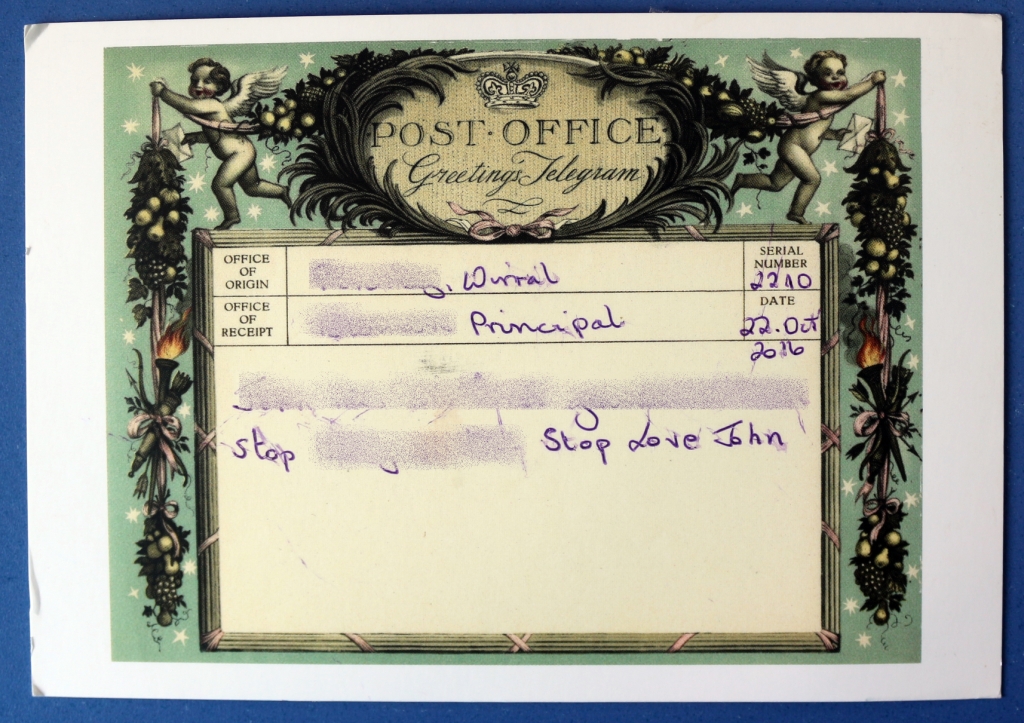 And the same week, John (the UK) had a similar idea. Not the address, but he wrote the message on the front side, in the form of an old telegram: