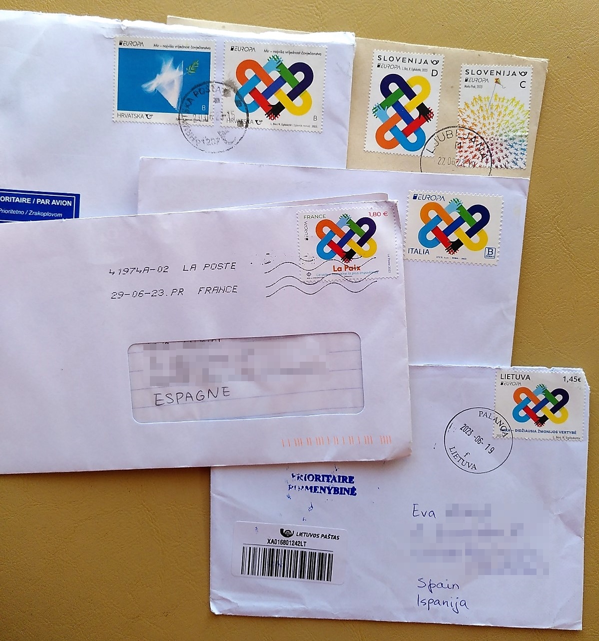 I thought it would be nice to get the stamp from as many countries as possible. So I arranged some swaps that are ongoing. The latest batch of peace has landed: from Croatia, France, Italy, Lithuania and Slovenia. Some countries, as you can see, have issued more than one stamp.