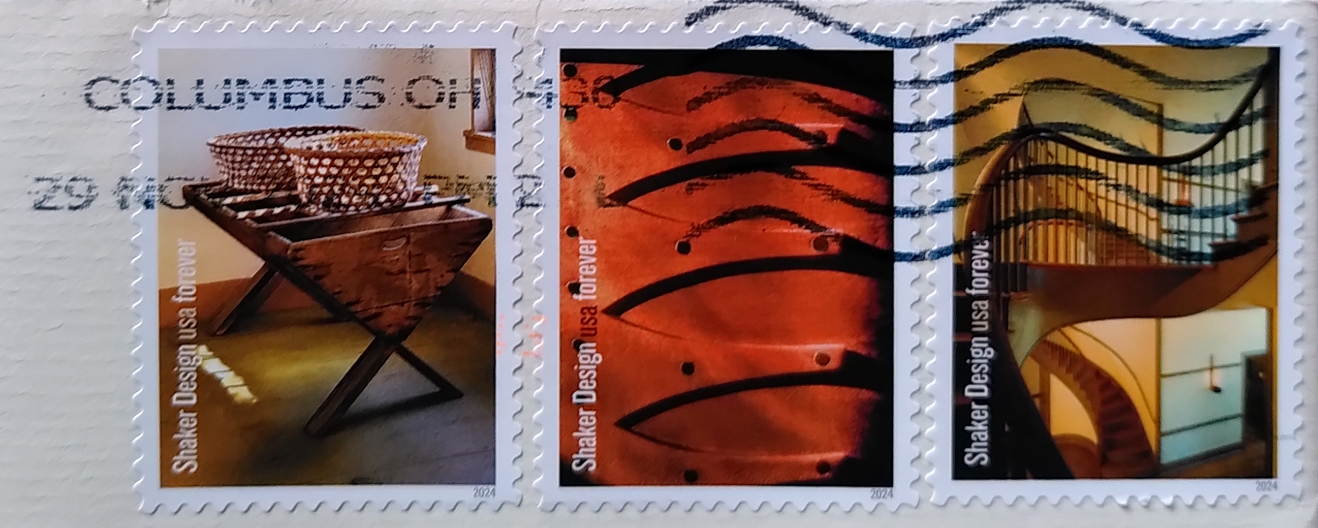 ... two mostly red stamps belonging to the set Shaker Design, issued by USPS last June, to coincide with the 25oth anniversary of the arrival of the first Shakers to America.